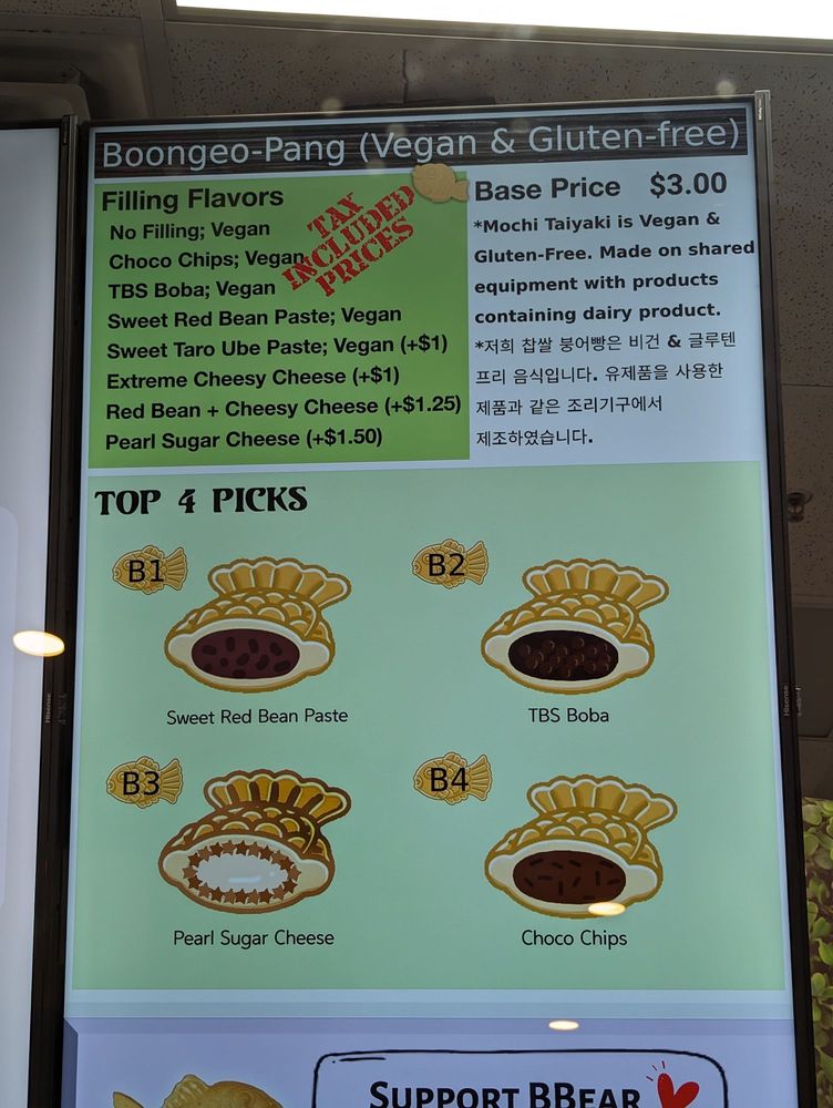 - Vegan Delights: Indulge in unique treats like vegan gluten-free boongeopang, filled with flavors like chocolate chip and taro ube.